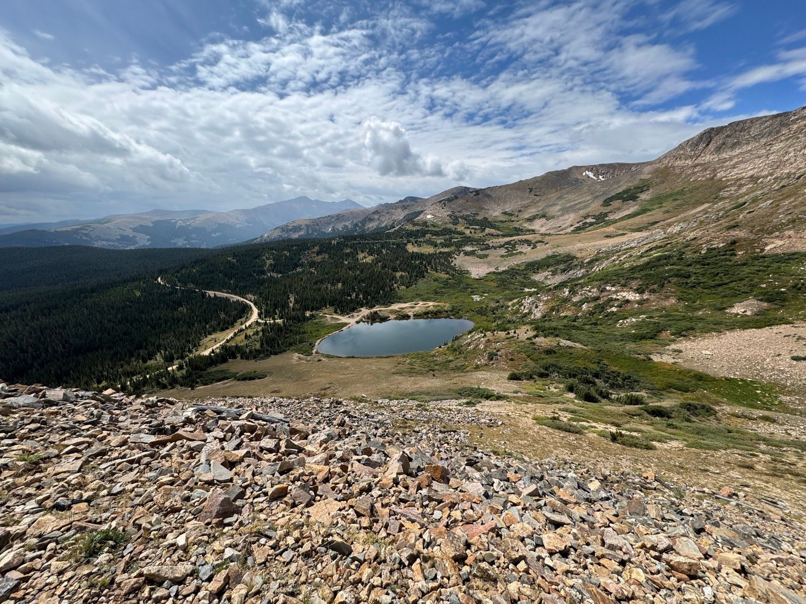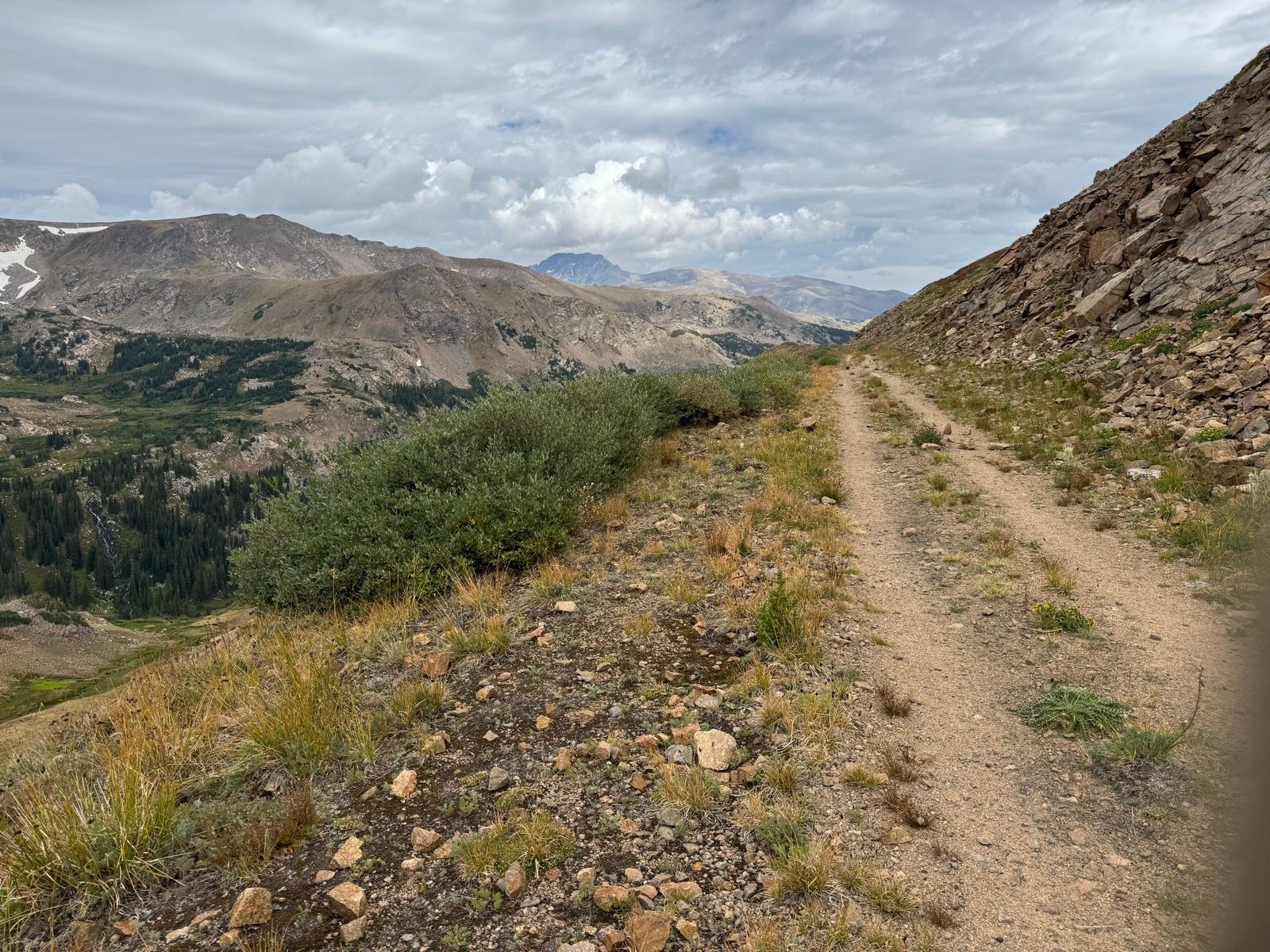 Easy climb up Rollins (4% grade!). The chunky road made for slow progress down, though with a fun surprise, when I rounded a bend, saw a person walking up the road with two dogs and unmistakable red hair and realized it was my friend Jessie with her pups and a backpack full of beer. The sun even came out while we sat watching trains move to and from the Moffat Tunnel.