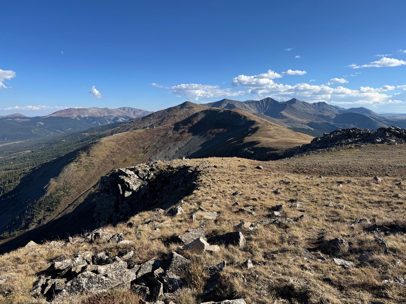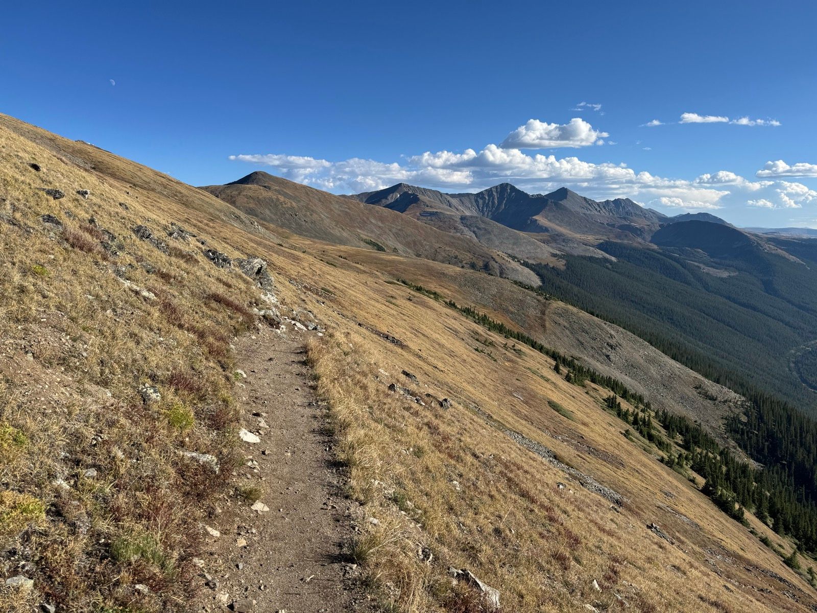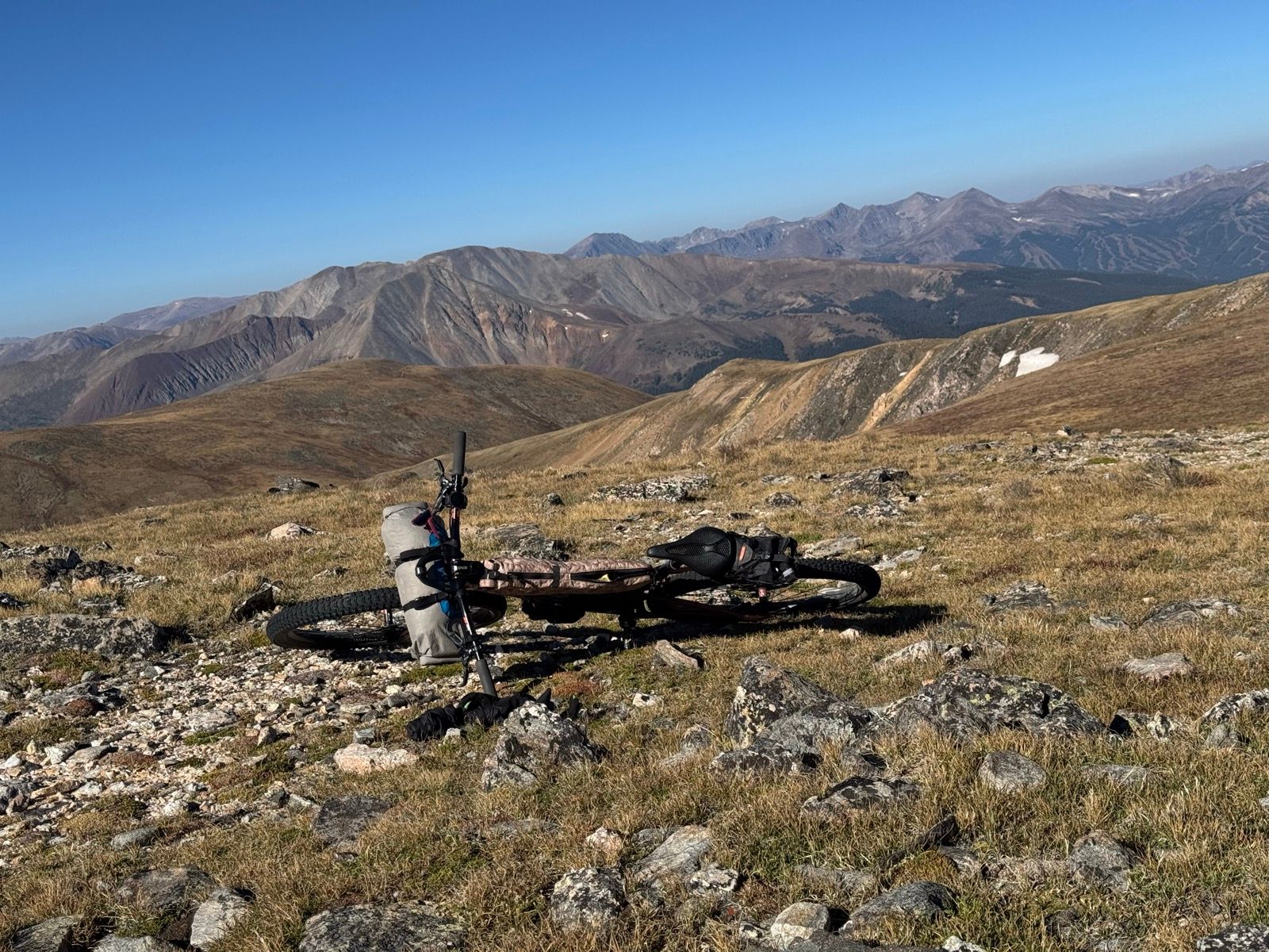 Crossing over the Tenmile Range (between Breckenridge and Copper) was more of a slog—lots of hike-a-bike up and dragging the brakes down the chunky trail down. (While stopped off in Breck and looking for dinner options in Copper, I accidentally got Google Maps directions to take the flat shared use path *around* the Tenmile Range to get to Copper in 70 minutes—not what I wanted to be thinking about while slogging for five hours *over* the range!)