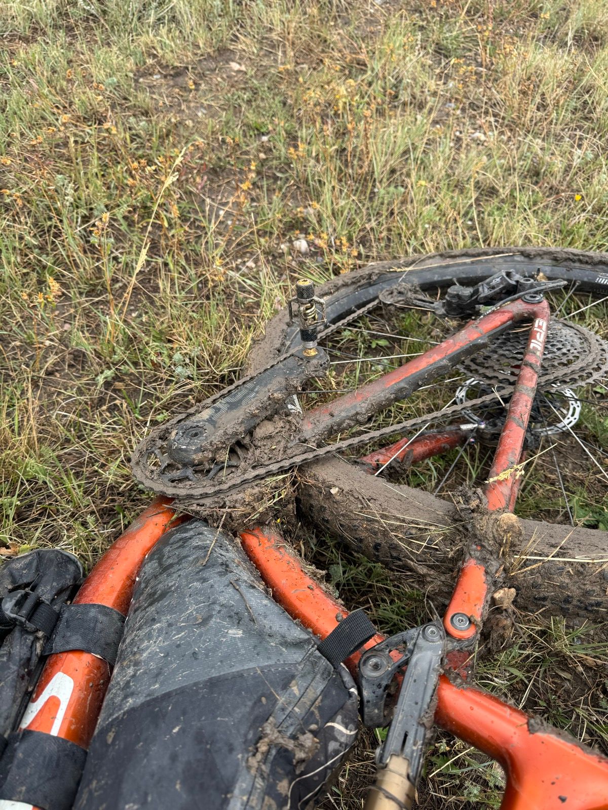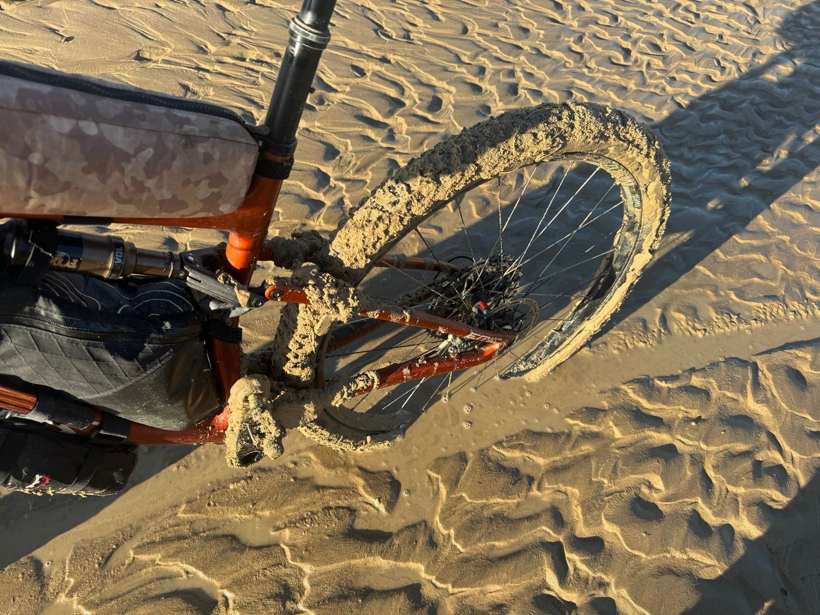 As soon as the sun came out, the surface of the dirt dried just enough such that passing a tire over it would dredge up the layer of mud beneath it, quickly bringing my wheels to a grinding halt.