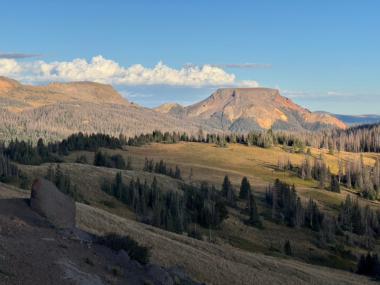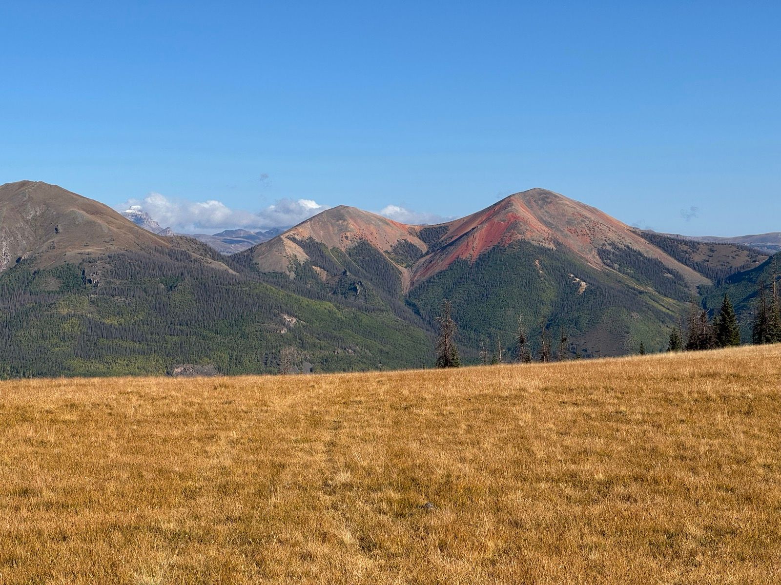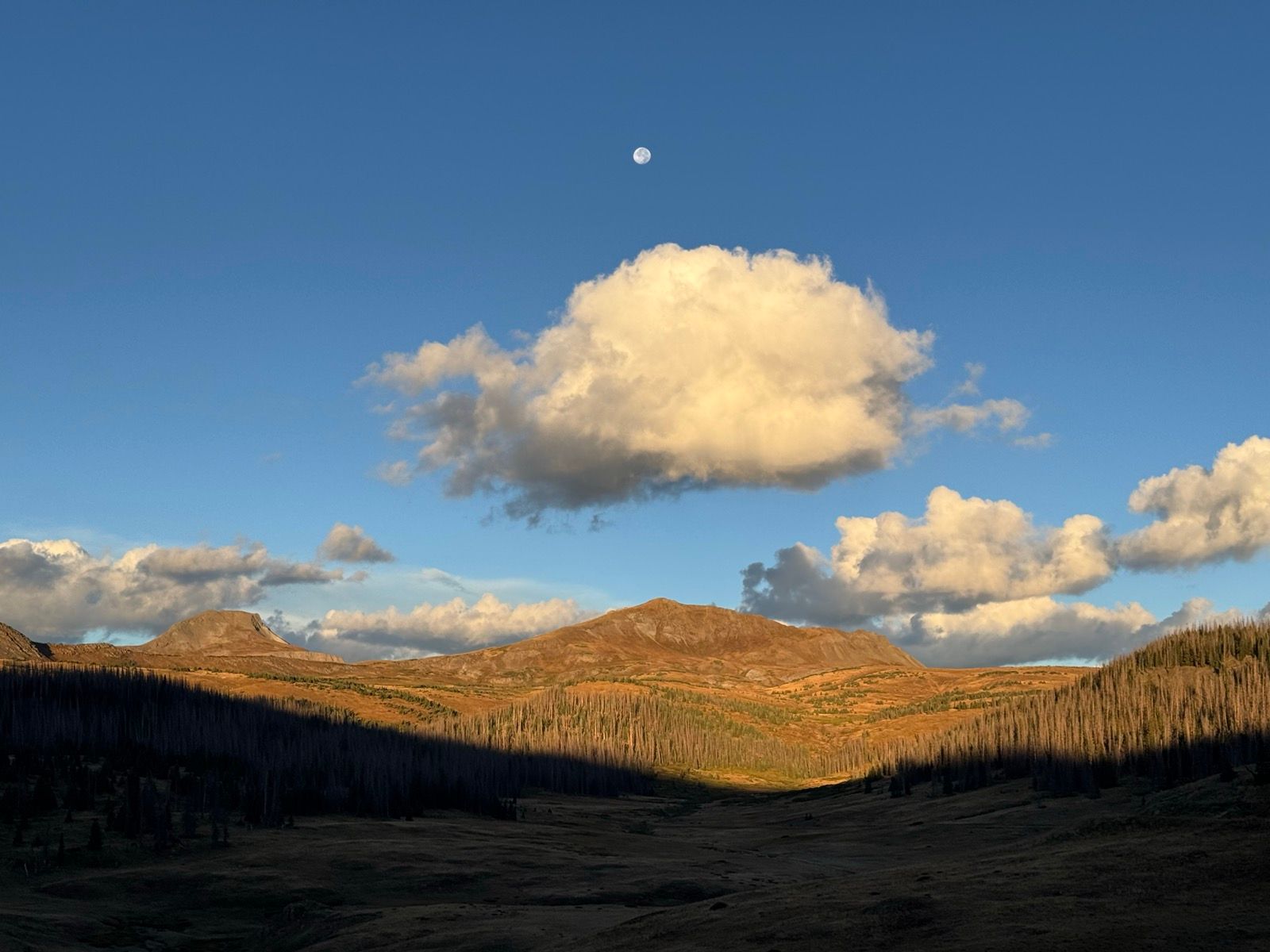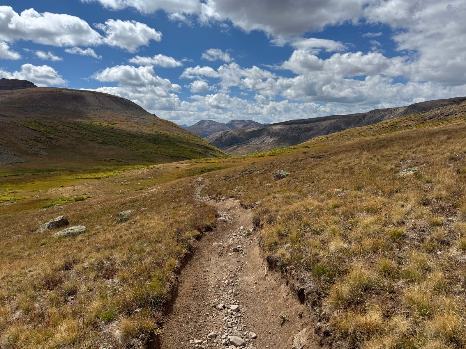 The immediate change in landscape is striking. I started the day among the jagged pinnacles and spires and ramparts of the volcanic southern San Juan mountains. By this afternoon, I’m crossing low ridge lines over rolling valleys of grass.